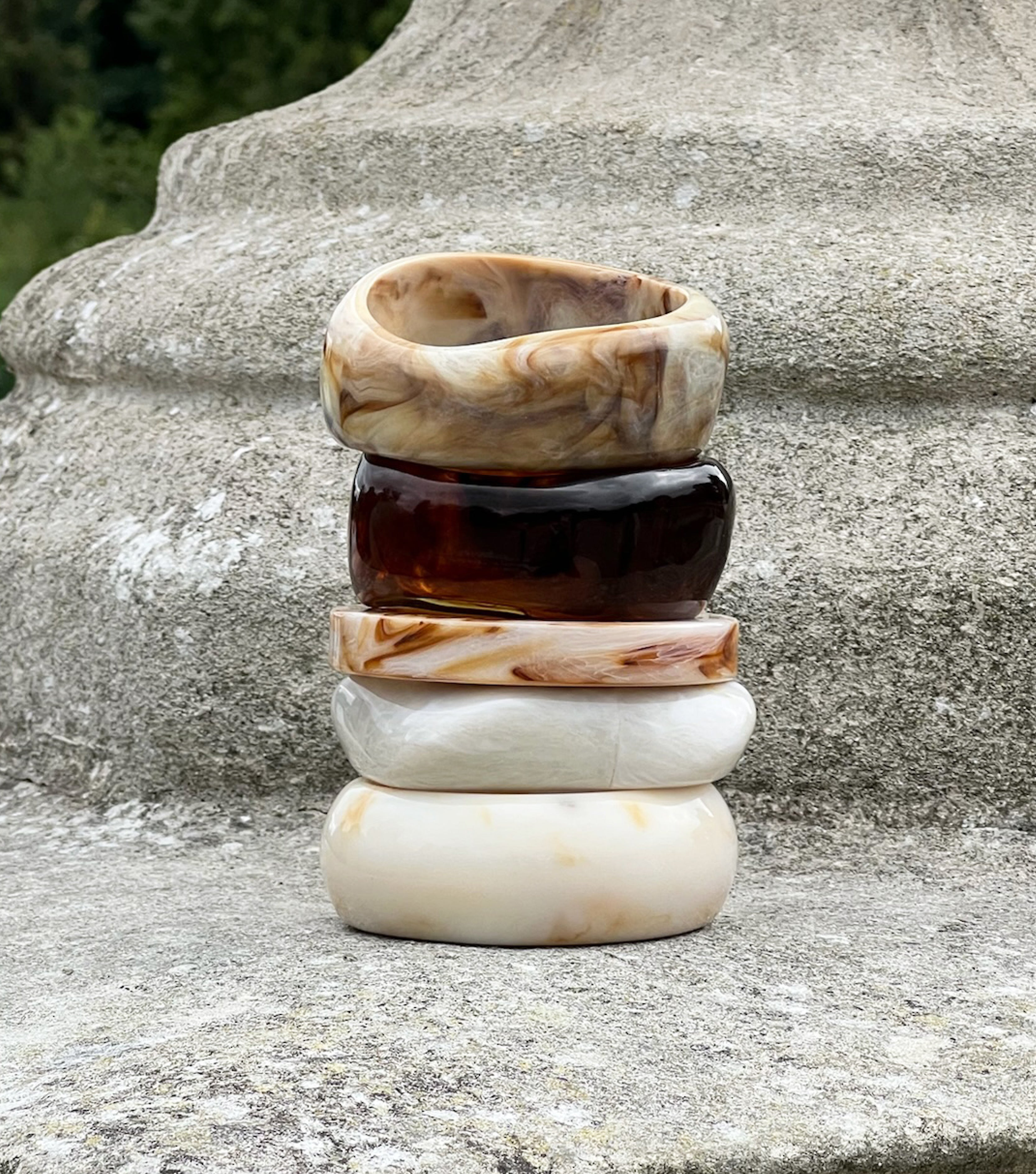 In rich variations of warm, neutral tones alongside sunny, bright pops of colour, these bangles are inspired by the slow rhythm of Mediterranean citrus groves, marble walls, and salt-kissed skin. Asymmetrical, statuesque, like stones you find on the beach, shaped by time and touch.